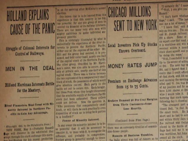 Un día como hoy 9 de Mayo de 1901 en Nueva York se genera pánico por la baja estrepitosa de acciones en Wall Street. El Pánico de 1901 fue la primera caída de la bolsa en la Bolsa de Valores de Nueva York, causado en parte por las luchas entre EH Harriman, Jacob Schiff y JP Morgan/James J. Hill para el control financiero de la Northern Pacific Railway. El stock de curvas fue orquestado por James Stillman y First National City Bank de William Rockefeller financió con el dinero de la Standard Oil. Después de llegar a un acuerdo, los magnates formaron la Northern Securities Company. Como resultado del pánico, se arruinaron miles de pequeños inversores. Los principales actores. Uno de los jugadores claves en esta era Edward Henry Harriman, que "por el presidente 1898was del comité ejecutivo de la Union Pacific y gobernó sin oposición. Pero se especula mucho con participaciones pacífico de la unión, y su intento de monopolizar el mercado ferroviario de Chicago llevó a el Pánico de 1901". El oponente de Harriman en la lucha por el Pacífico Norte fue James J. Hill, que se había aliado con el financiero JP Morgan. Causas. Una de las causas de esta caída de la bolsa fue el esfuerzo de Harriman para ganar el control del norte del Pacífico mediante la compra de sus acciones. El pánico comenzó cuando el mercado se estrelló durante aquella tarde de mayo. Los inversores no vieron venir, pero la 1:00 pm, el descenso en el mercado estaba empezando a mostrar. Primero fue la disminución gradual en stock Burlington. Había sido alta durante toda la mañana, pero de repente una debilidad aguda se produjo. Los precios de las acciones, como St. Paul, Missouri el Pacífico, y la Unión del Pacífico comenzaron a caer. Muy pronto todo el mercado se estaba ahogando. Los inversores que habían celebrado una vez fuertemente a sus poblaciones estaban vendiendo fuera de puro pánico. Otros tuvo éxito y una abrumadora grito de "vender! Vender! Vender!" se escuchó en todo el piso de la Bolsa de Valores de Nueva York. Durante la venta, el rumor se extendió entre los comerciantes que Arthur Housman, broker de JP Morgan, había muerto. Housman, el jefe de A.A. Housman y Company, fue llevado al piso de la Bolsa de Valores de Nueva York para asegurar que los operadores JP Morgan seguía haciendo negocios. Efectos. Poblaciones afectadas incluyen St. Paul, Union Pacific, Missouri Pacífico, cobre unida, Sugar, Atchison, y United States Steel. Sin embargo, no todas las acciones terminaron el día con una nota áspera. Pacífico Norte no sólo había evitado una caída, sino que también había visto un avance neto de 16 puntos. Resultados. Como resultado de este accidente, Harriman y Hill se unieron para formar una sociedad de cartera, la Compañía de Valores del Norte, para controlar el Pacífico Norte, el Gran Norte y la Burlington. Esta empresa fue cerrada poco por debajo de la Sherman Antitrust Act de 1890.